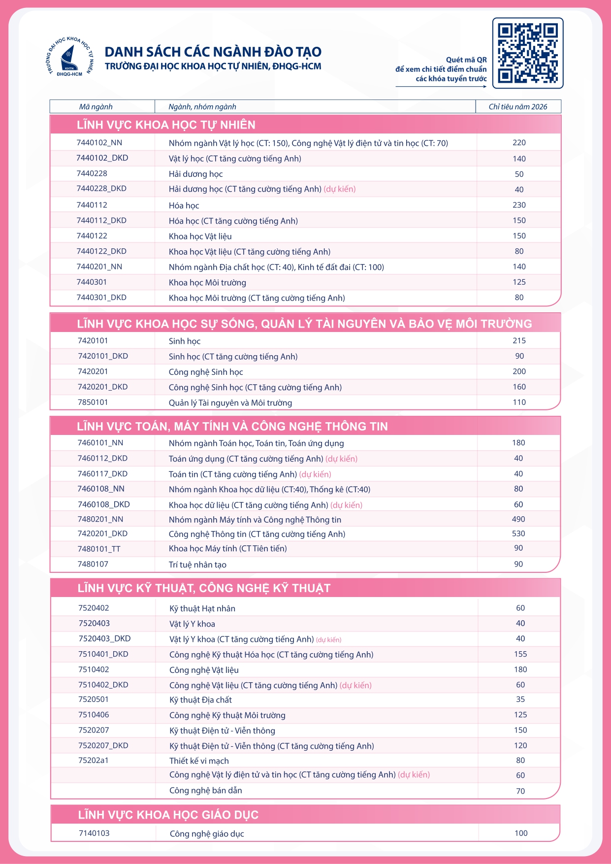 Năm 2025, trường Đại học Khoa học tự nhiên, ĐHQG-HCM tuyển sinh 31 ngành/ nhóm ngành thuộc 8 lĩnh vực. Em xem thông tin chi tiết về các ngành / nhóm ngành tại đây nhé.