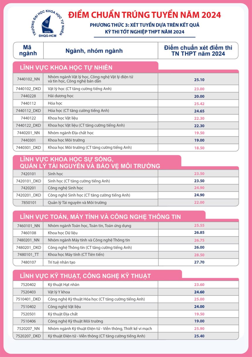 Chiều ngày 17.8, Hội đồng tuyển sinh Trường đại học Khoa học tự nhiên, Đại học Quốc gia Thành phố Hồ Chí Minh (Trường ĐH KHTN, ĐHQG-HCM) thông báo Điểm trúng tuyển Đại học chính quy năm 2024 theo phương thức Xét tuyển kết quả Kỳ thi tốt nghiệp THPT như sau: